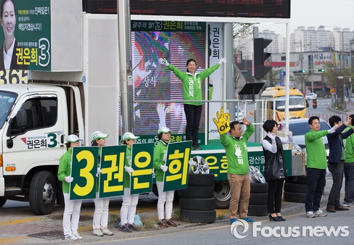(광주=포커스뉴스) 4.13총선을 하루 앞둔 12일 오후 광주 광산구 타이어테크 수완점 앞에서 권은희 국민의당 광산구을 후보 선거운동원들이 지지를 호소하고 있다.