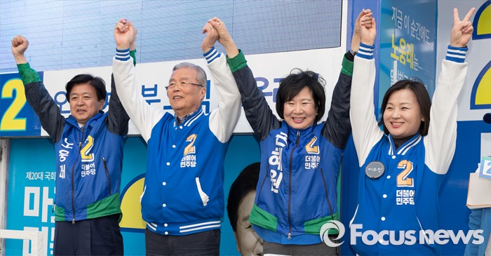 (서울=포커스뉴스) 2016 제20대 국회의원선거를 하루 앞둔 12일 오후 서울 마포구 공덕역 인근 경의선숲길공원에서 노웅래 더불어민주당 마포갑 후보, 김종인 더불어민주당 비대위 대표 겸 선대위원장, 손혜원 마포을 후보가 유권자들에게 지지를 호소하고 있다.