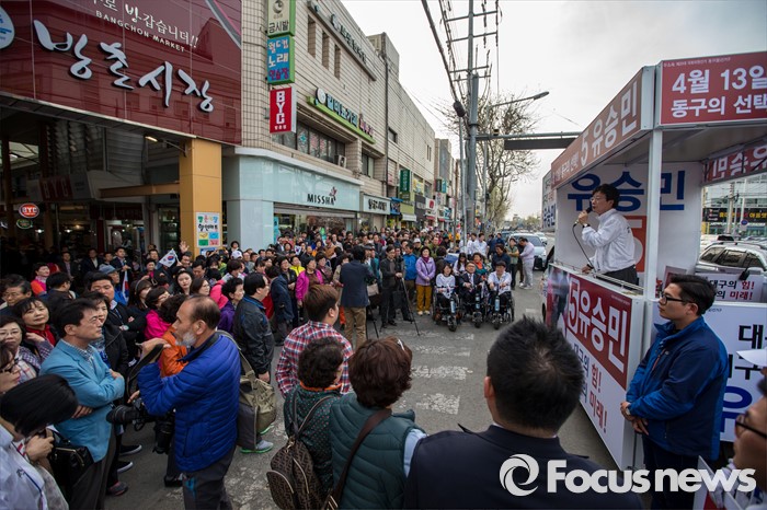 (대구=포커스뉴스) 유승민 무소속 대구 동구을 후보가 12일 오후 대구광역시 동구 방촌시장에서 유세를하며 유권자들에게 한 표를 호소 하고 있다.
