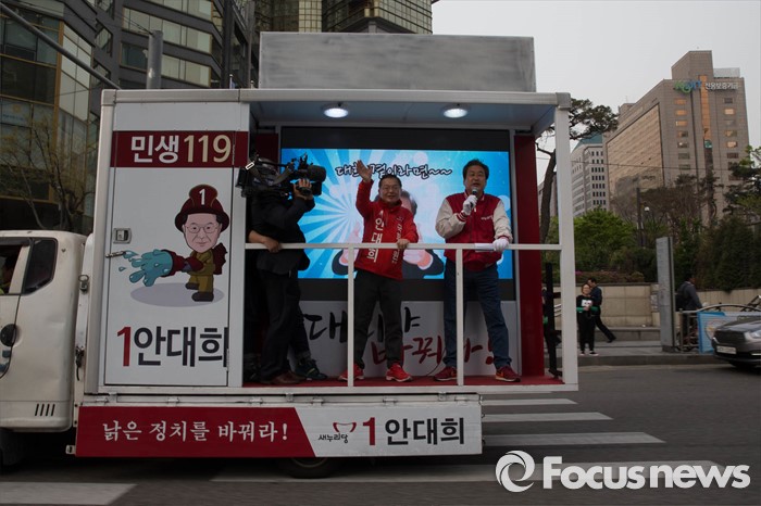 (서울=포커스뉴스) 20대 총선을 하루 앞둔 12일 오후 서울 용산구의 한 아파트 일대에서 김무성 새누리당 대표가 안대희 마포갑 후보 지원유세를 하고 있다.