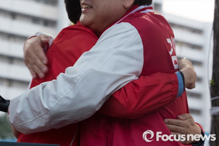 (서울=포커스뉴스) 12일 오후 서울 노원구 GS수퍼마켓 상계점 앞에서 김무성 새누리당 대표가 이준석 새누리당 노원병 후보자 지원 유세를 하고 있다.