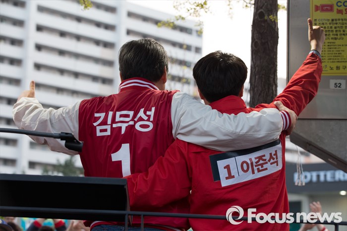 (서울=포커스뉴스) 12일 오후 서울 노원구 GS수퍼마켓 상계점 앞에서 김무성 새누리당 대표가 이준석 새누리당 노원병 후보자 지원 유세를 하고 있다.