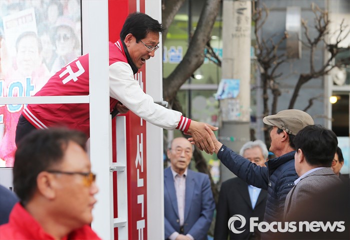 (서울=포커스뉴스) 4.13총선을 하루 앞둔 12일 오후 서울 영등포구 당산역 인근에서 박선규 새누리당 영등포갑 후보가 한 시민과 악수하고 있다.