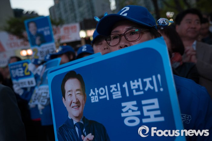 (서울=포커스뉴스) 20대 총선을 하루 앞둔 12일 오후 서울 종로구의 한 아파트 일대에서 유권자들이 정세균 더불어민주당 종로구 후보가 막바지 선거유세를 지켜보고 있다.
