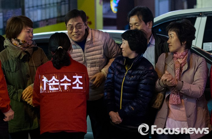 (부산=포커스뉴스) 4.13총선 선거운동 마지막날인 12일 오후 부산 사상구 엄궁초등학교 인근에서 손수조 새누리당 부산 사상구 후보가 지지자들과 악수하고 있다.