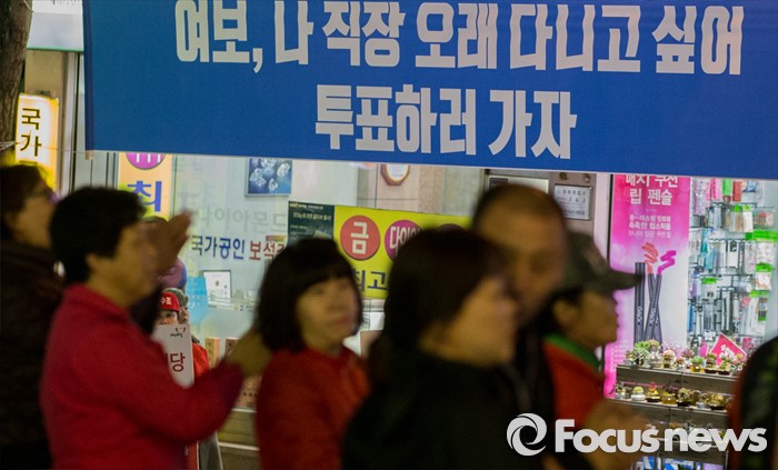(부산=포커스뉴스) 4.13총선 선거운동 마지막날인 12일 오후 부산 사상구 엄궁초등학교 인근에서 열린 손수조 새누리당 부산 사상구 후보 유세현장에 투표를 독려하는 ㄴ현수막이 붙어 있다.