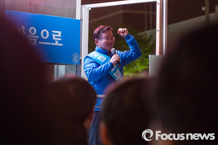 (대구=포커스뉴스) 김부겸 더불어민주당 수성구갑 후보가 12일 오후 대구광역시 수성구 신매네거리에서 유세를하며 유권자들에게 한 표를 호소 하고 있다.
