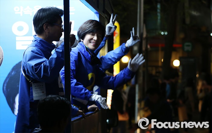 (서울=포커스뉴스) 4.13총선을 하루 앞둔 12일 오후 서울 영등포구 영등포역 인근에서 김영주 더불어민주당 영등포갑 후보가 선거유세를 하고 있다.