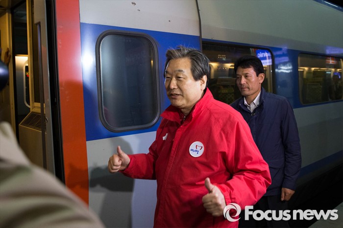 (서울=포커스뉴스) 20대 총선을 하루 앞둔 12일 오후 서울 용산구 서울역 KTX 플랫폼에서 김무성 새누리당 대표가 부산으로 가기 위해 기차로 향하고 있다.