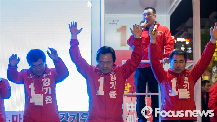 (창원=포커스뉴스) 4.13총선 선거운동 마지막날인 12일 오후 경남 창원시 상남분수광장에서 강기윤 새누리당 창원 성산구 후보가 유권자들의 지지를 호소하고 있다.