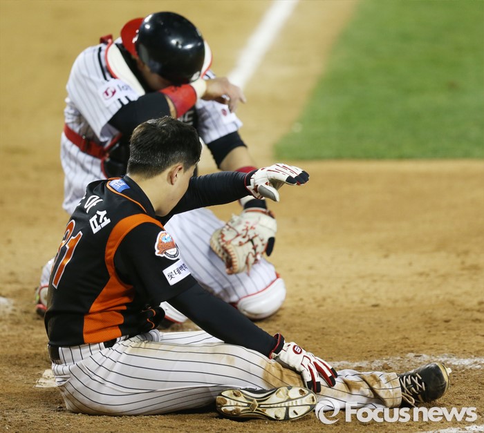 (서울=포커스뉴스) 12일 서울 잠실구장에서 열린 2016 프로야구 롯데-LG 경기 9회 1사 1,2루에서 롯데 황재균의 내야안타때 2루주자 손아섭이 홈에서 아웃된후 주저앉아 있다.