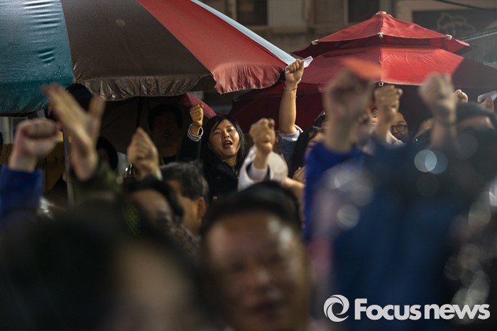 (대구=포커스뉴스) 12일 오후 대구광역시 동구 평화시장 닭똥집골목에서 권은희 무소속 대구 북구갑 후보, 유승민 무소속 대구 동구을 후보, 유성걸 대구 동구갑 후보 지지자들이 후보들을 보며 환호 하고 있다.