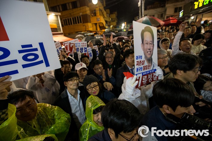 (대구=포커스뉴스) 12일 오후 대구광역시 동구 평화시장 닭똥집골목에서 권은희 무소속 대구 북구갑 후보, 유승민 무소속 대구 동구을 후보, 유성걸 대구 동구갑 후보 지지자들이 후보들을 보며 환호 하고 있다.
