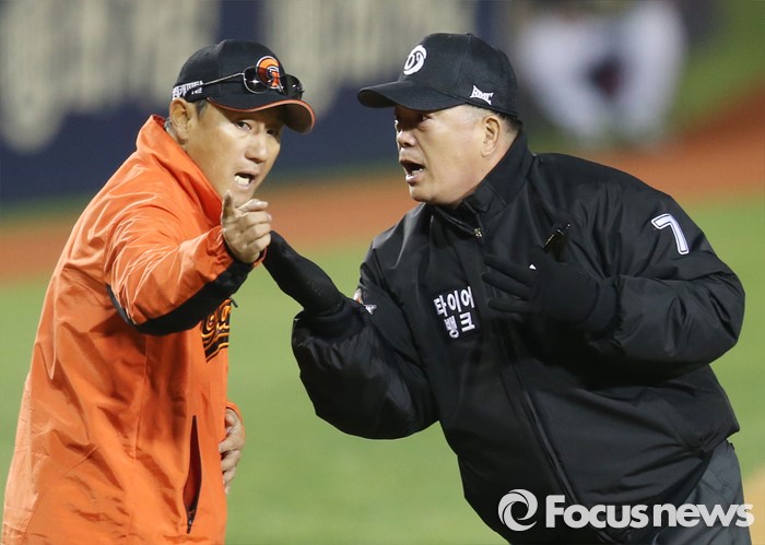 (서울=포커스뉴스) 12일 서울 잠실구장에서 열린 2016 프로야구 롯데-LG 경기에서 9회초 롯데 조원우 감독이 비디오 판독 결과에 대해 문승훈 심판조장에게 항의하고 있다.