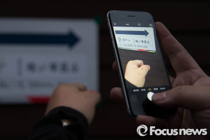 (서울=포커스뉴스) 제20대 국회의원선거일인 13일 오전 서울 성북구의 한 투표소에서 유권자가 투표 인증샷을 남기고 있다.
