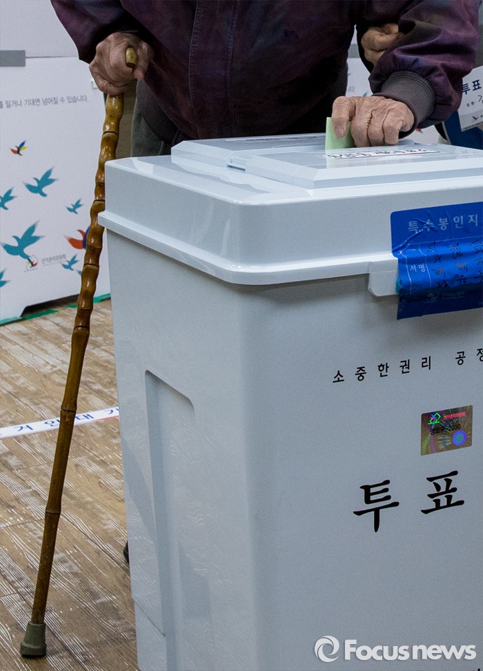 (부산=포커스뉴스) 제20대 국회의원선거일인 13일 오전 부산 영도구 동삼1동 제6투표소에서 지팡이를 짚은 노인이 투표하고 있다.
