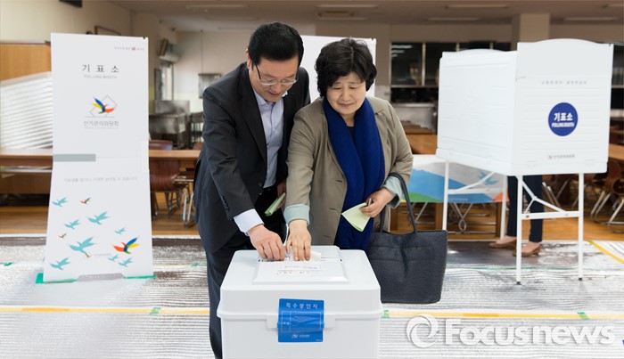 (광주=포커스뉴스) 제20대 국회의원 선거일인 13일 오전 광주 광산구 산월동 봉산초등학교에서 이용섭(왼쪽) 더불어민주당 광주 광산구을 후보가 부이 신영옥씨와 투표를 하고 있다.