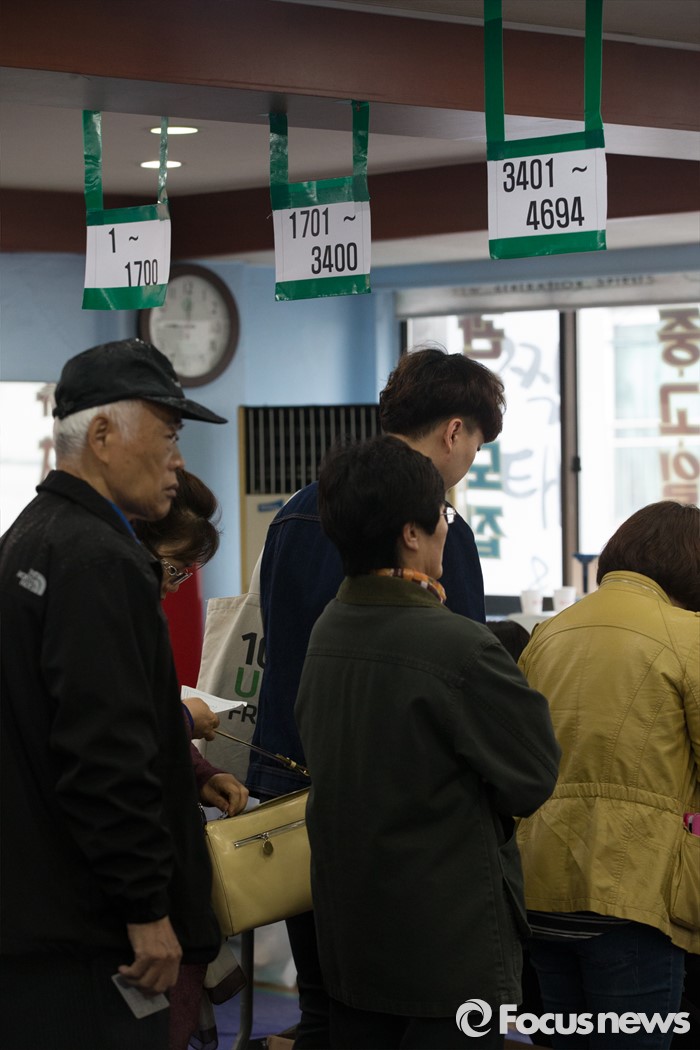 (서울=포커스뉴스) 제20대 국회의원선거일인 13일 오전 서울 강서구 화곡제8동 제5투표소에서 유권자들이 투표를 위해 본인확인절차를 밟고 있다.