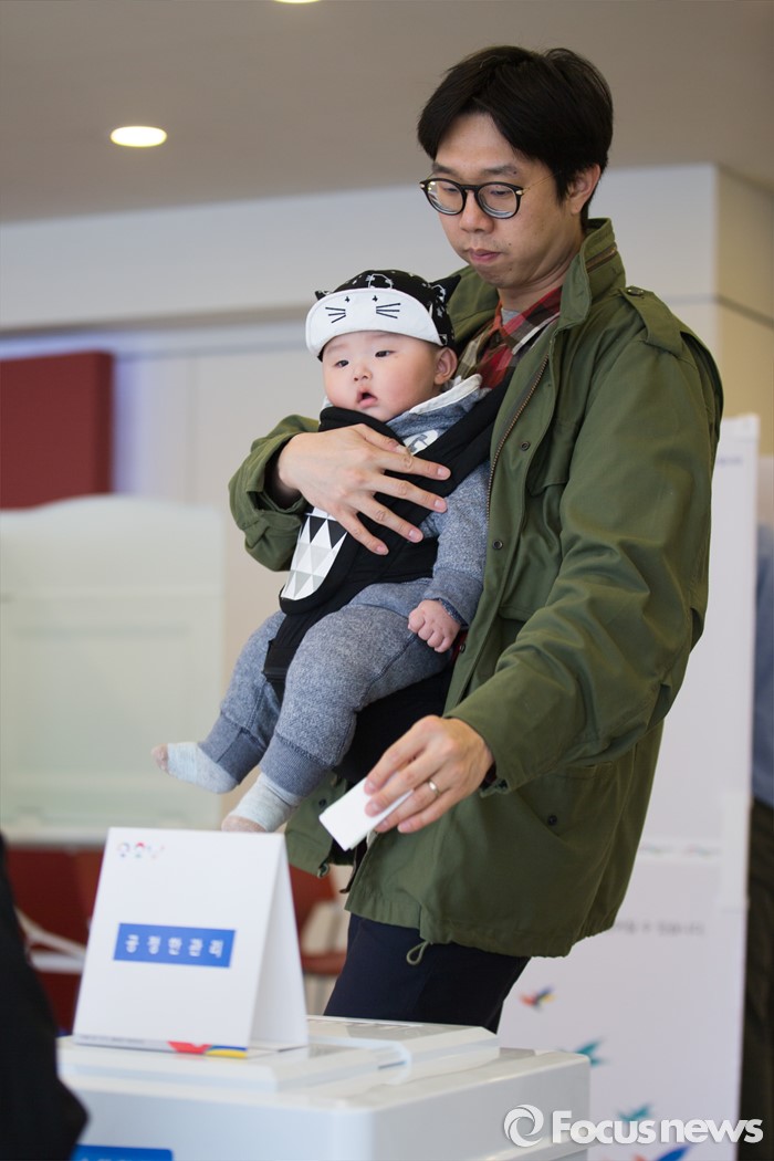(서울=포커스뉴스) 제20대 국회의원선거일인 13일 오전 서울 광진구 능동 제3투표소에서 한 유권자가 아이와 함께 투표하고 있다.