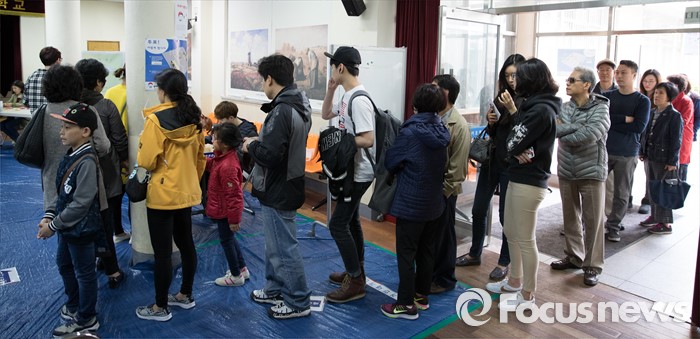 (서울=포커스뉴스) 2016 제20대 국회의원선거날인 13일 오후 서울 서초구 서이초등학교에 마련된 투표소에서 유권자들이 투표를 하기 위해 대기하고 있다.