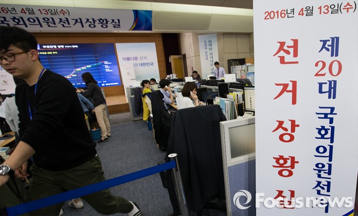 (서울=포커스뉴스) 제20대 국회의원선거일인 13일 오후 경기도 과천 중앙선거관리위원회에 마련된 선거상황실에서 직원들이 분주히 업무를 보고 있다.