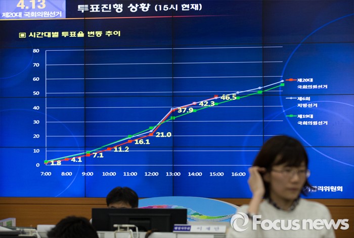 (서울=포커스뉴스) 제20대 국회의원선거일인 13일 오후 경기도 과천 중앙선거관리위원회에 마련된 선거상황실에서 직원들이 분주히 업무를 보고 있다.