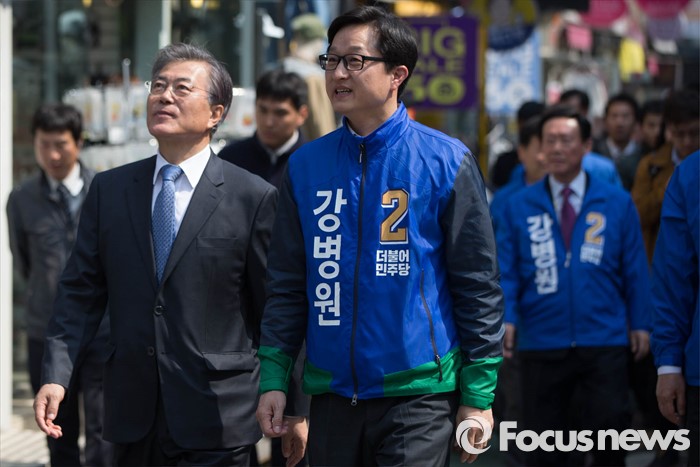 (서울=포커스뉴스) 13일 오후 6시 KBS·MBC·SBS 지상파 방송3사가 공동조사, 발표한 4·13 총선 출구조사 결과에 따르면 서울 은평을에서 더불어민주당 강병원 후보가 38.2%로 당선이 유력한 것으로 나타났다.1일 오후 문재인 전 더불어민주당 대표가 서울 은평구 연신내역 앞에서 강병원 은평을 후보와 함께 유세를 하고 있다. 2016.04.01 성동훈 기자