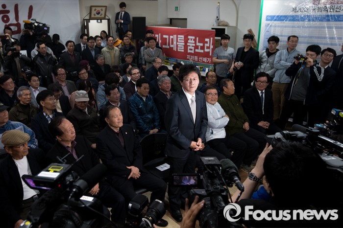 (대구=포커스뉴스) 제20대 국회의원선거 출구조사를 통해 유승민 무소속 대구 동구을 후보가 당선이 예측된 13일 오후 대구 동구 유 후보 선거사무소에서 유승민 후보가 지지자들의 축하를 받고 있다.