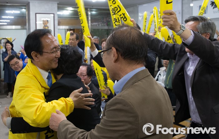 (창원=포커스뉴스) 제20대 국회의원선거가 끝난 13일 오후 창원시 성산구의 선거사무소에서 노회찬 정의당 창원 성산구 후보가 '예측 당선'이라는 방송사 출구조사 결과가 나오자 부인 김지선씨와 포옹하고 있다.
