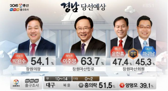 (서울=포커스뉴스)13일 오후 6시 KBS·MBC·SBS 지상파 방송3사가 공동조사, 발표한 4·13 총선 출구조사 결과에 따르면 경남 창원 마산합포 지역구에서는 이주영 새누리당 후보가 63.7%로 당선이 유력한 것으로 나타났다.<사진출처=KBS 출구방송 화면캡쳐>
