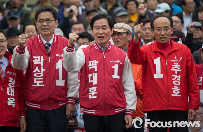 (서울=포커스뉴스) 13일 오후 6시 KBS·MBC·SBS 지상파 방송3사가 공동조사 발표한 4·13 총선 출구조사 결과에 따르면 대구 달성군 지역구에서는 새누리당 추경호 후보가 51.0%로 당선이 유력한 것으로 나타났다.(대구=포커스뉴스) 새누리당 대구지역 후보자들이 6일 오후 대구광역시 달서구 성당동 일대에서 대구지역 후보자 총집결 거리유세를 하고 있다. 오른쪽부터 추경호 달성군 후보, 곽대훈 달서구갑 후보, 곽상도 중구남구 후보 2016.04.06 김흥구 기자