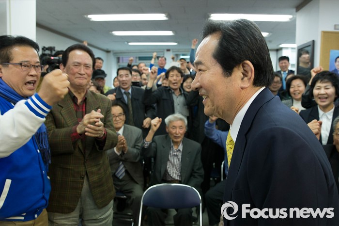 (서울=포커스뉴스) 제20대 국회의원선거일인 13일 오후 서울 종로구 정세균 더불어민주당 종로구 후보의 사무실에서 지지자들이 정 후보에게 환호를 보내고 있다.