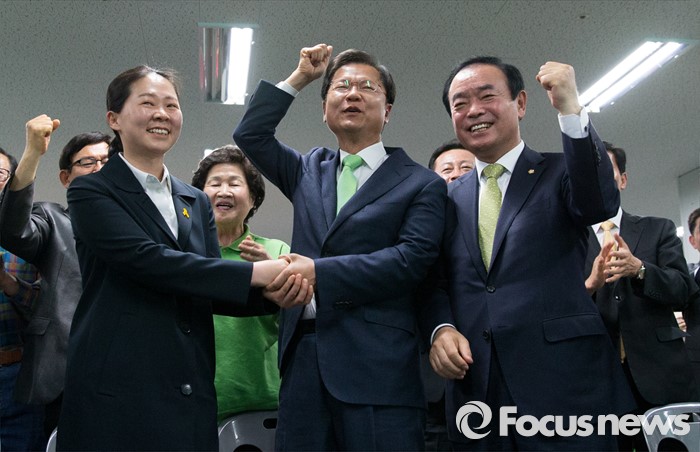 (광주=포커스뉴스) 제20대 국회의원 선거일인 13일 오후 광주 서구 국민의당 광주광역시당에서 천정배(가운데) 국민의당 공동대표와 권은희(왼쪽) 국민의당 광산구을 후보가 출구조사 결과를 보고 환호하고 있다. 오른쪽은 장병완 동구남구갑 후보.