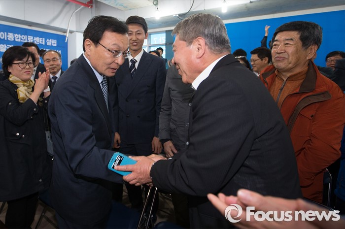 (세종=포커스뉴스) 제20대 국회의원선거가 마감된 가운데 이해찬 무소속 후보가 13일 오후 세종시 도담동 선거사무소에서 방송3사 출구조사 결과 앞서는 것으로 나타나자 지지자들과 악수를 하며 선거사무소를 나서고 있다.
