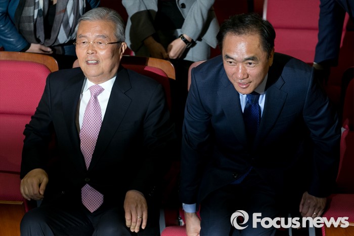 (서울=포커스뉴스) 20대 총선 투표일인 13일 오후 서울 여의도 국회 의원회관 대회의실에 마련된 더불어민주당 개표상황실에서 김종인(왼쪽) 비대위 대표 겸 선대위원장과 정장선 총선기획단장이 자리에 앉고 있다.