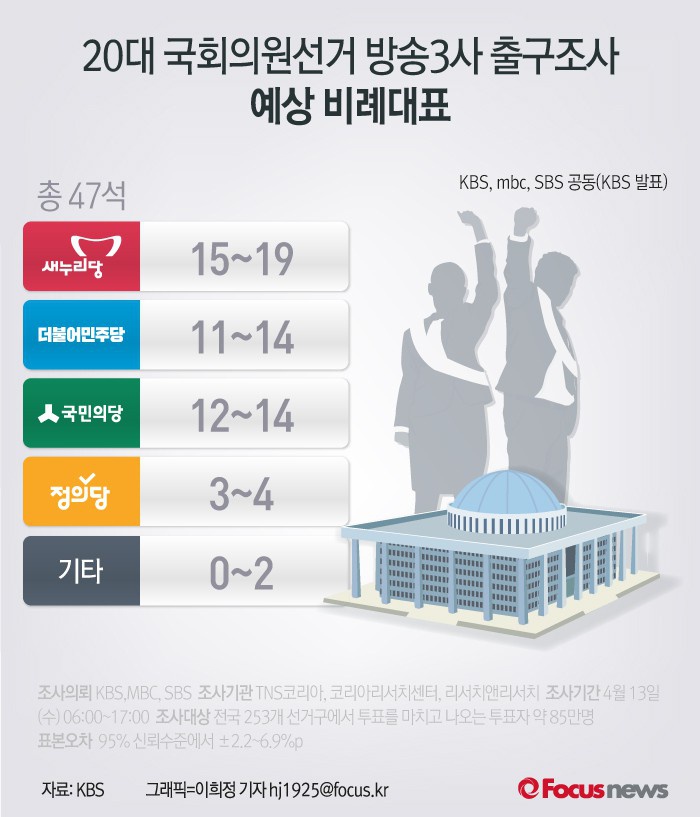 (서울=포커스뉴스) KBS발표 20대 국회의원선거 방송3사 공동 출구조사 예상 비례대표 의석수 비교.