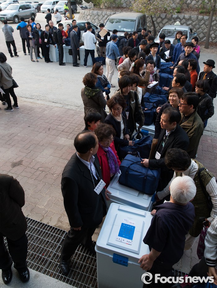 (서울=포커스뉴스) 제20대 국회의원선거일인 13일 오후 서울 종로구 경기상업고등학교 체육관에 마련된 개표소에서 종로구 선거관리위원회 관계자들이 투표함 인계 순서를 기다리고 있다.