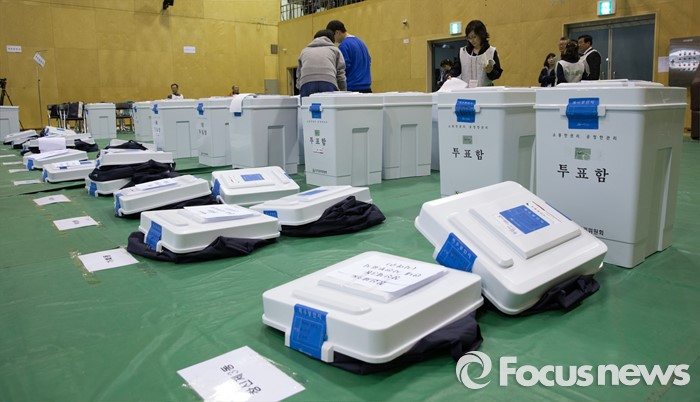 (서울=포커스뉴스) 제20대 국회의원선거일인 13일 오후 서울 종로구 경기상업고등학교 체육관에 마련된 개표소에서 투표함들이 나란히 개표를 기다리고 있다.