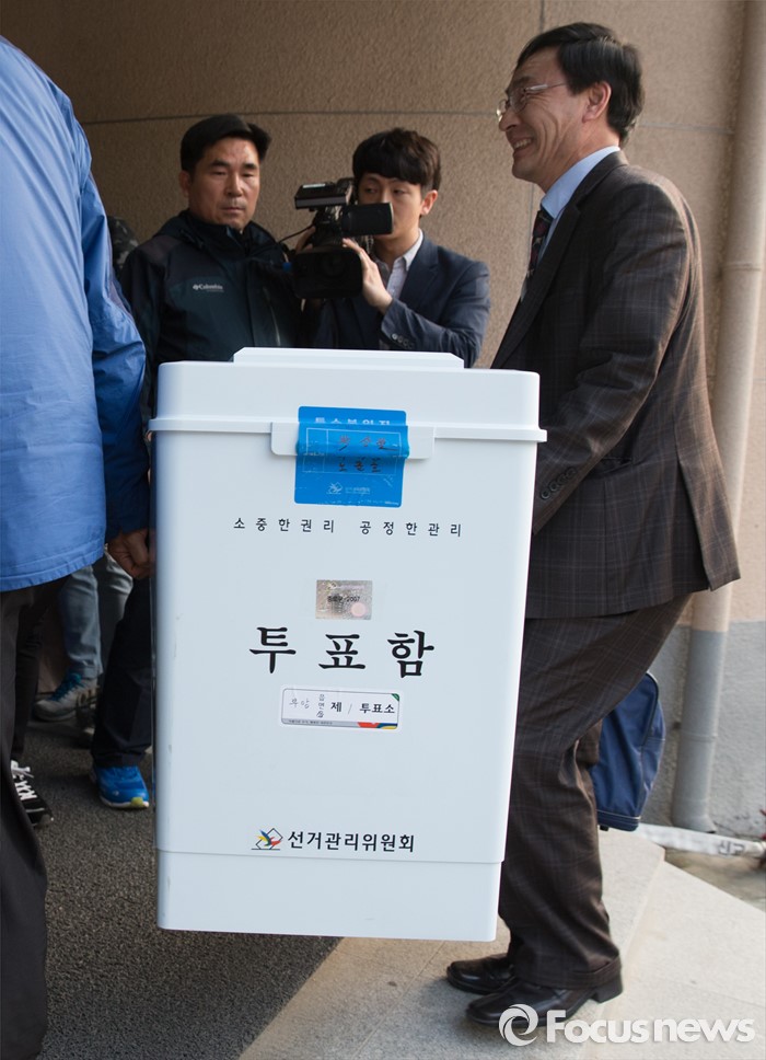 (서울=포커스뉴스) 제20대 국회의원선거일인 13일 오후 서울 종로구 경기상업고등학교 체육관에 마련된 개표소에서 종로구 선거관리위원회 관계자들이 투표함을 옮기고 있다.