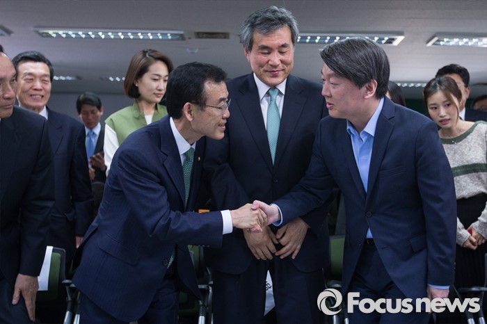 (서울=포커스뉴스) 안철수 국민의당 상임공동대표와 임내현 선거대책위원회 상황본부장이 13일 오후 서울 마포구 당사 개표상황실에서 인사를 나누고 있다.