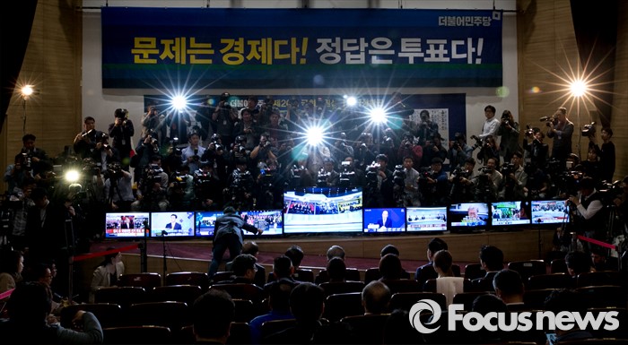 (서울=포커스뉴스) 20대 총선 투표일인 13일 오후 서울 여의도 국회 의원회관 대회의실에 마련된 더불어민주당 개표상황실에서 취재진이 김종인 비대위 대표 겸 선대위원장 등 선대위원들의 출구조사 및 개표방송을 시청하는 모습을 취재하고 있다.