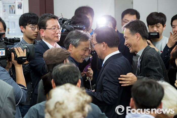 (대구=포커스뉴스) 제20대 국회의원선거 출구조사를 통해 김부겸 더불어민주당 대구 수성갑 후보가 김문수 새누리당 대구 수성갑 후보를 제치고 당선이 예측된 13일 오후 대구 수성구 김 후보 선거사무소에서 김부겸 후보가 지지자들에게 둘러 싸여 축하를 받고 있다.