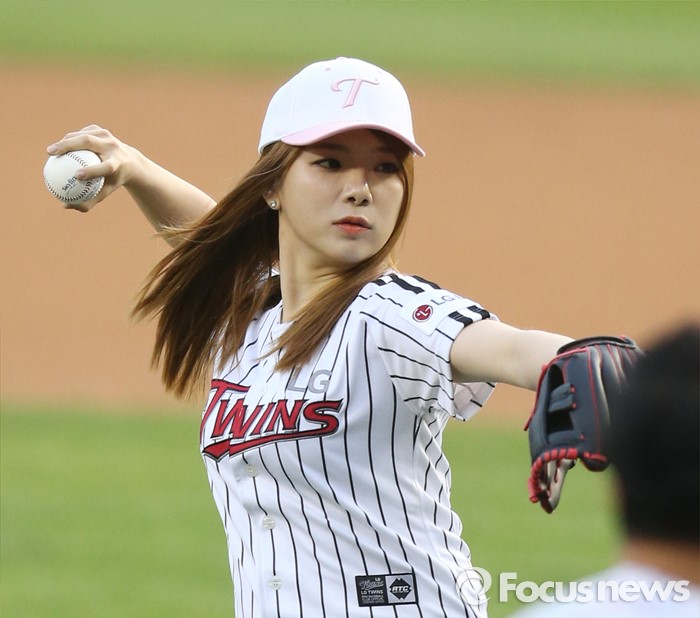 (서울=포커스뉴스) 13일 서울 잠실구장에서 열린 2016 프로야구 롯데-LG 경기에서 가수 타이니가 시구하고 있다.