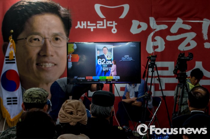 (대구=포커스뉴스) 제20대 국회의원선거 출구조사 결과 대구 수성갑 새누리당 김문수 후보가 38퍼센트에 그치며 당선이 불투명한 13일 오후 대구 수성구 김 후보 선거사무소에 지지자들이 개표방송을 보고 있다.
