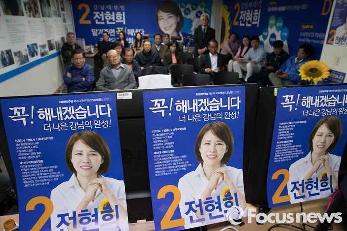 (서울=포커스뉴스) 2016 제20대 국회의원선거날인 13일 오후 서울 강남구 로즈데일빌딩에 위치한 전현희 더불어민주당 강남을 후보 선거사무소에서 지지자들이 방송사의 개표방송을 지켜보고 있다.