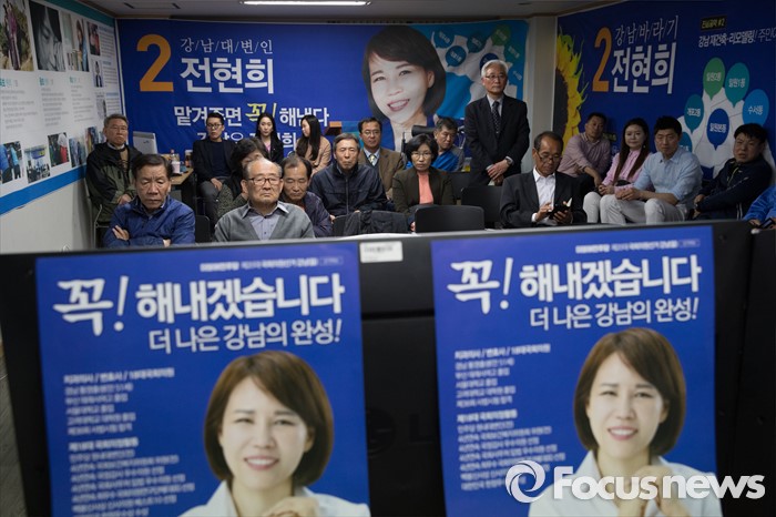 (서울=포커스뉴스) 2016 제20대 국회의원선거날인 13일 오후 서울 강남구 로즈데일빌딩에 위치한 전현희 더불어민주당 강남을 후보 선거사무소에서 지지자들이 방송사의 개표방송을 지켜보고 있다.