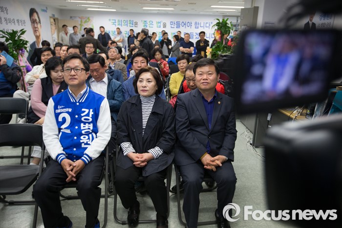 (서울=포커스뉴스) 13일 오후 서울 은평구 강병원 더불어민주당 은평구을 후보의 사무실에서 강후보가 지지자들과 함께 개표방송을 보고 있다.