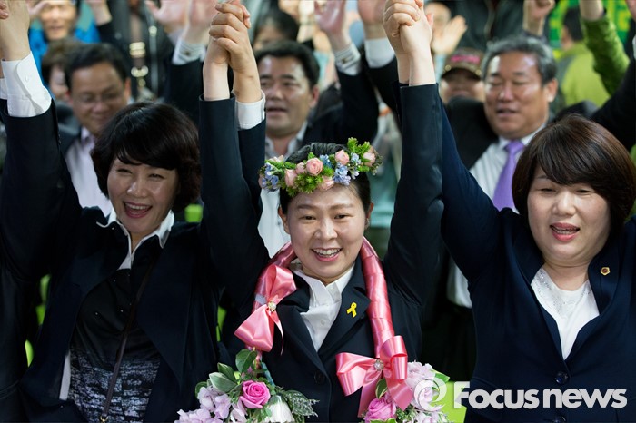 (광주=포커스뉴스) 권은희 국민의당 광주 광산구을 후보가 13일 오후 광주 광산구 수완동 선거사무실에서 당선이 유력해지자 지지자들과 환호하고 있다.