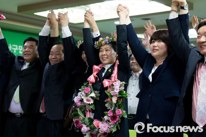 (광주=포커스뉴스) 권은희 국민의당 광주 광산구을 후보가 13일 오후 광주 광산구 수완동 선거사무실에서 당선이 유력해지자 지지자들과 환호하고 있다.