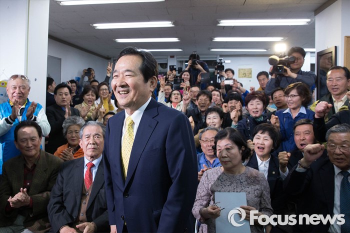 (서울=포커스뉴스) 제20대 국회의원선거일인 13일 오후 정세균 더불어민주당 종로구 후보가 서울 종로구 자신의 사무실에서 53.9%의 득표로 오세훈 새누리당 후보를 누르고 당선이 확실시 되자 세리머니를 하고 있다.